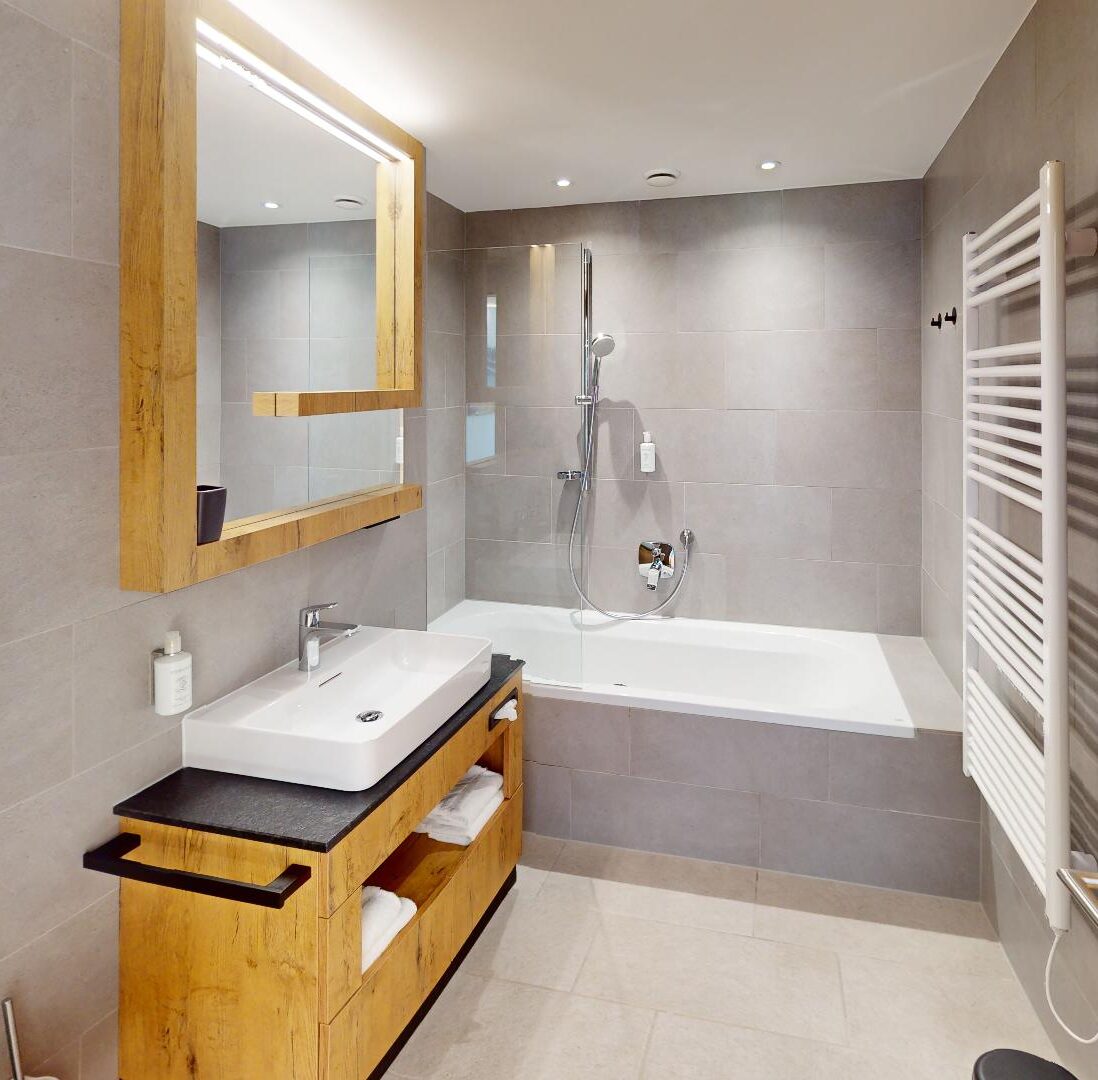 Deze ruime slaapkamers zijn ontworpen met het oog op rust en ultiem comfort en zijn voorzien van driedubbele beglazing voor zowel geluidsisolatie als thermische efficiëntie. Het interieur is uitgevoerd met hoogwaardige materialen en stijlvolle afwerkingen die een brug slaan tussen authentiek Tirools karakter en moderne functionaliteit. Het is een verfijnde leefruimte waar de ‘alpine charme’ opnieuw is uitgevonden voor de veeleisende, moderne reiziger.